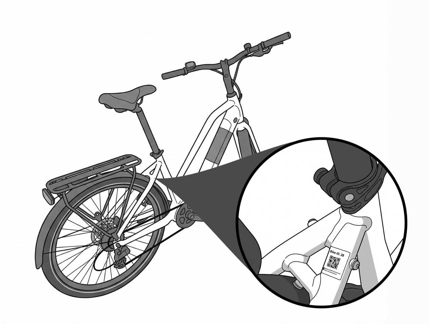 L'identifiant du vélo se trouve sur le cadre du vélo, entre la roue arrière et la tige de selle. Voir image ci-dessous.